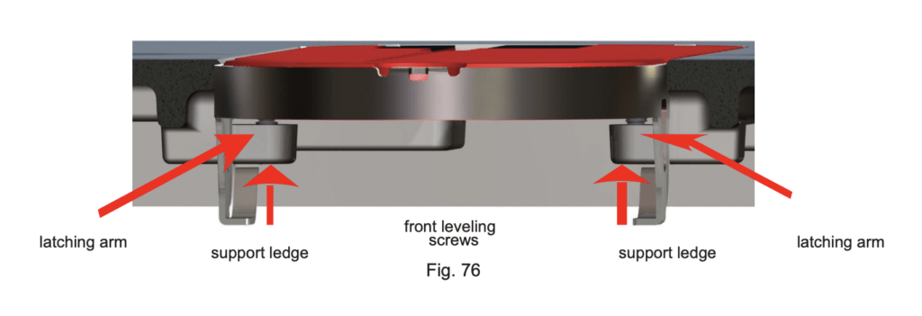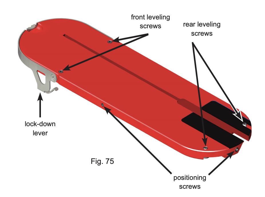 To set the height of the insert, use the included 3 mm hex L-wrench to adjust the front and rear leveling screws until the insert is just below the surface of the table. The lower end of each front leveling screw should rest on the corresponding support ledge on the table (see Fig. 76). When the lock-down lever is in the down and locked position, latching arms extend under each of the support ledges to prevent the insert from rising up.